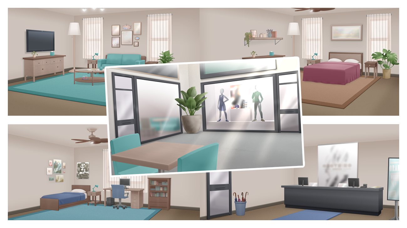 You can create various rooms, such as a living room, bedrooms, study, or stores and businesses, such as a shopping street, mall, a reception or bakery.