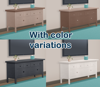 Every piece of wooden furniture comes in 4 colors (light brown, dark brown, black and white). Everything else comes in teal, meant for you to hue-shift to whichever color you'd like.